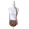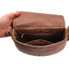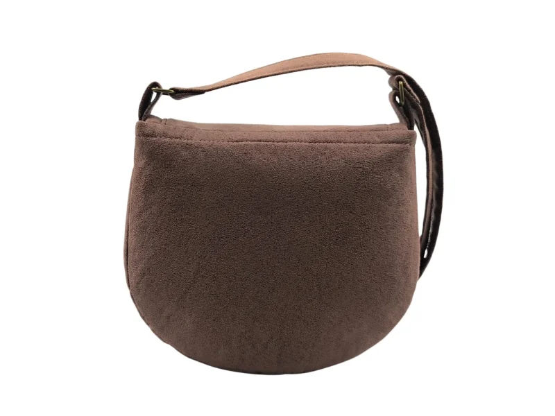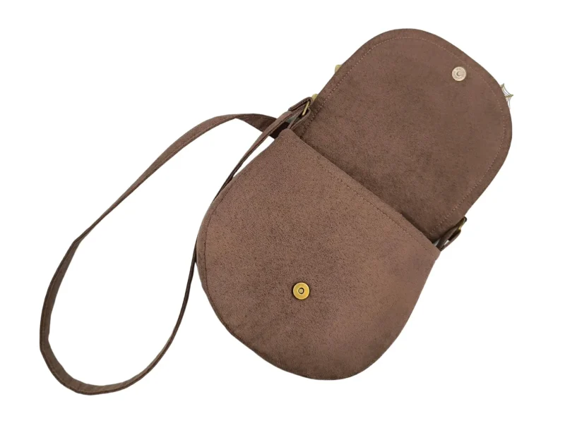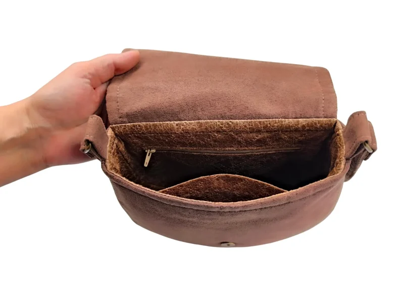 Το εσωτερικό είναι επενδεδυμένο με καπιτονέ καφέ φόδρα και διαθέτει δύο τσέπες — μία ανοιχτή και μία με φερμουάρ. Μπορεί να φορεθεί χιαστί ή στον ώμο, προσφέροντας άνεση και στυλ σε κάθε εμφάνιση.