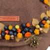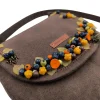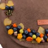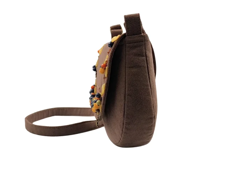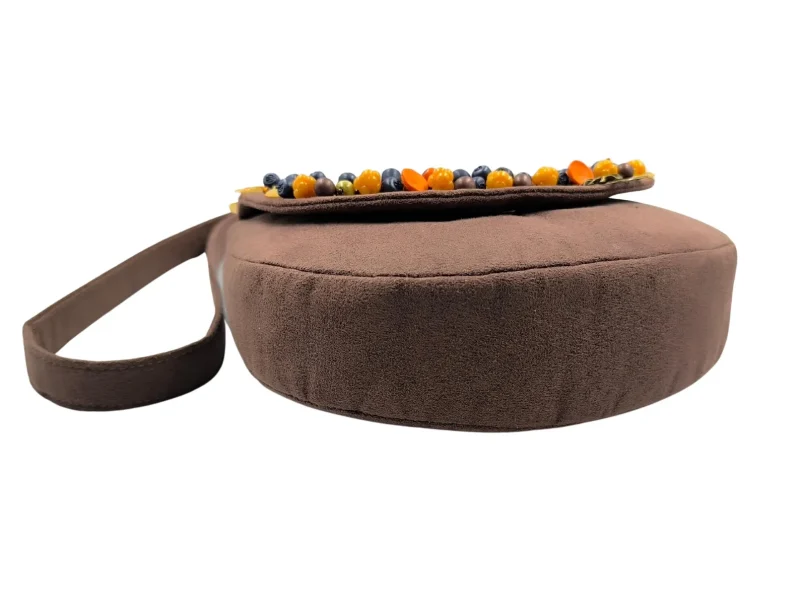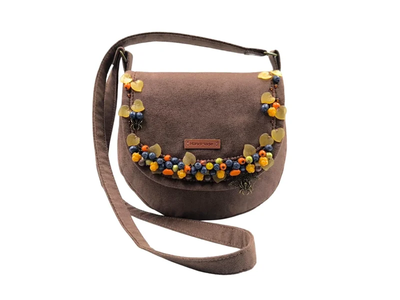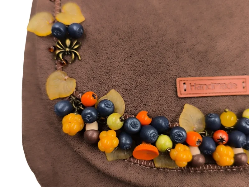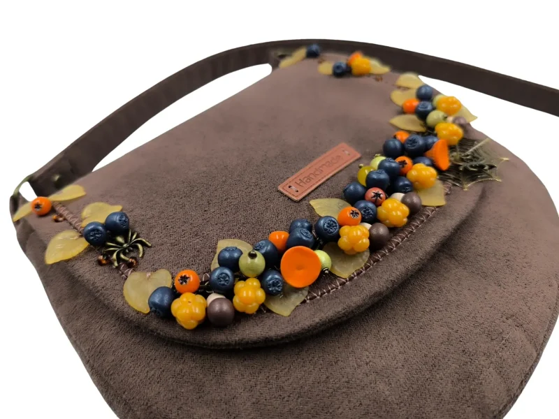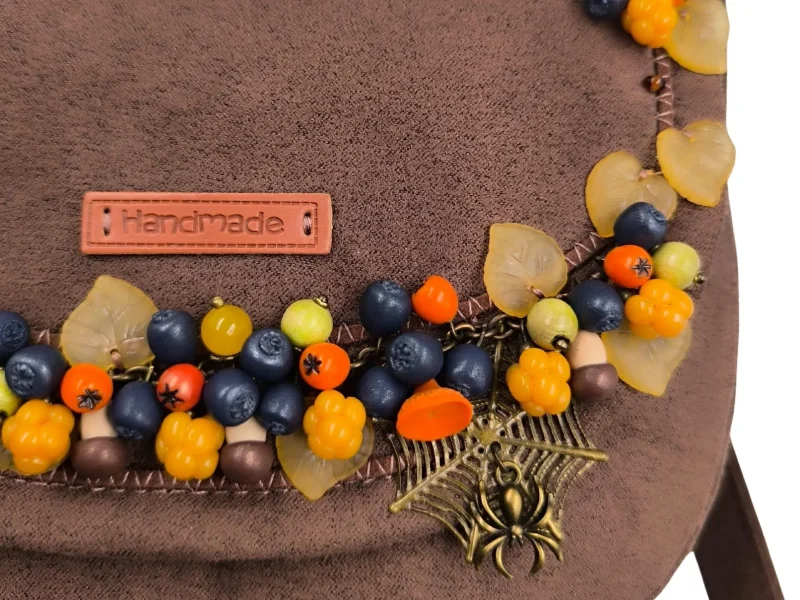 Χειροποίητη τσάντα από συνθετικό καφέ σουέτ, διακοσμημένη με φθινοπωρινά στοιχεία φτιαγμένα στο χέρι. Μούρα και μανιτάρια από πολυμερικό πηλό, ακρυλικά φύλλα και μπρονζέ μεταλλικά διακοσμητικά με αράχνες και ιστούς συνθέτουν μια μοναδική σύνθεση εμπνευσμένη από τη φύση.