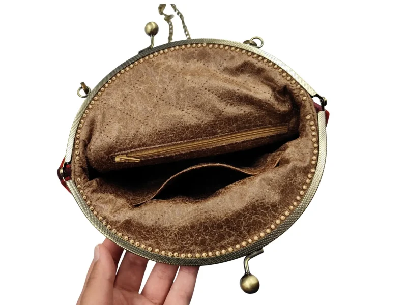 Η τσάντα κλείνει με μπρονζέ οβάλ μεταλλικό στόμιο (20 εκ).