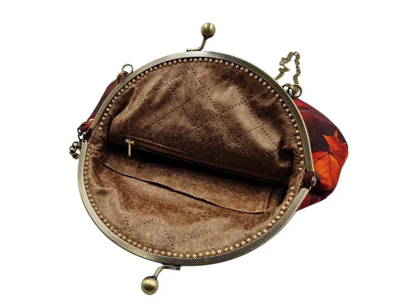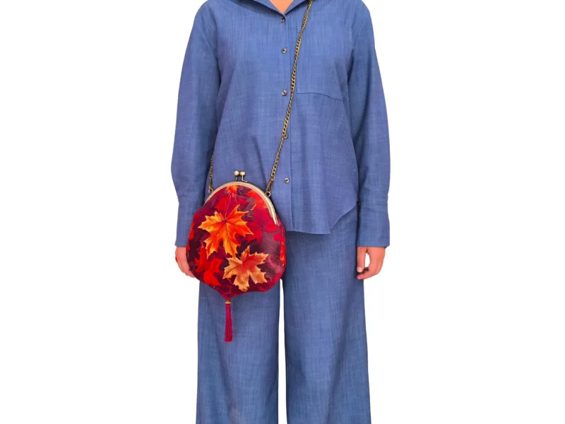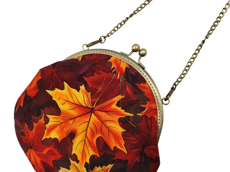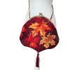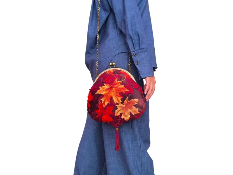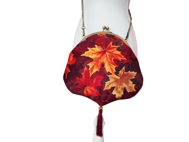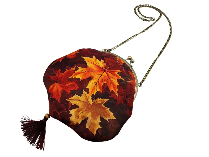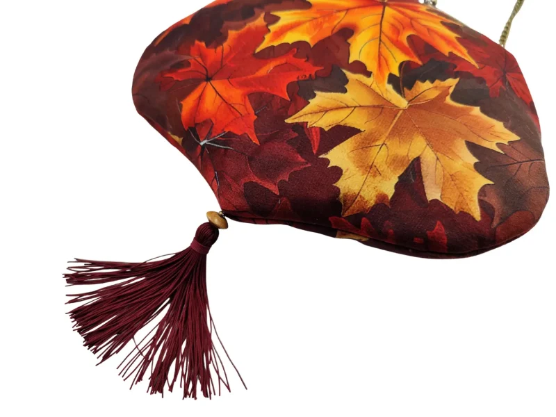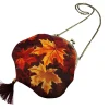 Ζήστε τη μαγεία του φθινοπώρου με αυτή την εντυπωσιακή χειροποίητη τσάντα από συνθετικό βελούδο με σχέδιο φθινοπωρινά φύλλα και φούντα στο τελείωμα.