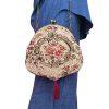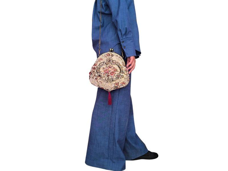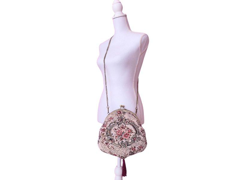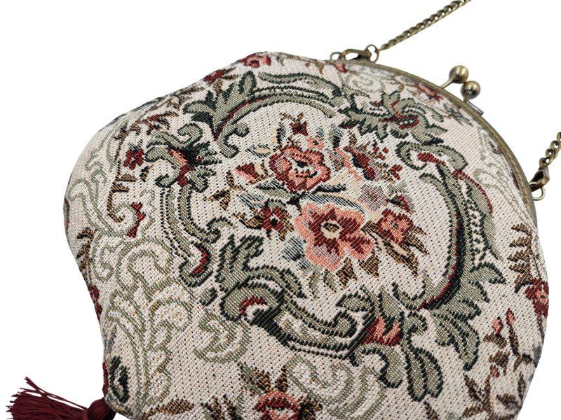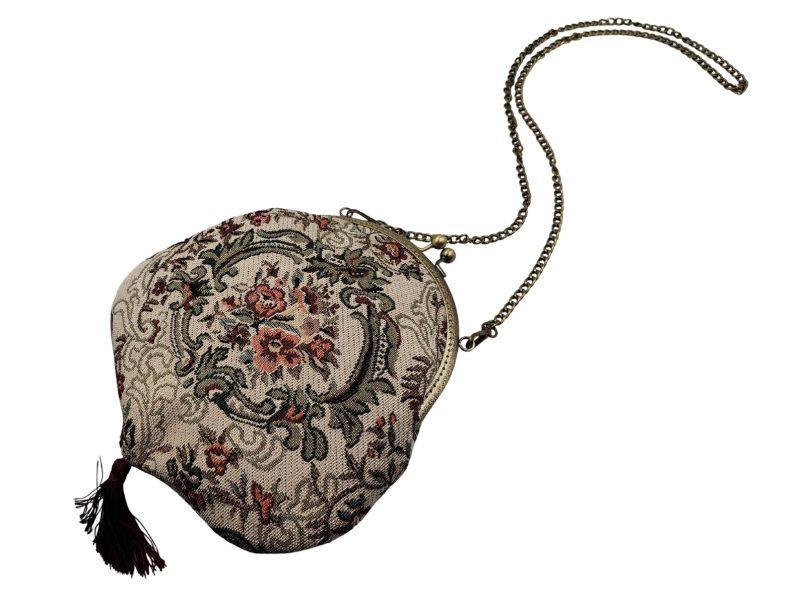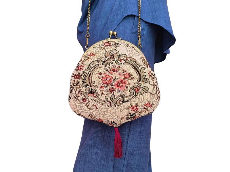Χειροποίητη τσάντα Vintage style με ύφασμα στόφα με φλοράλ σχέδιο και φούντα στο τελείωμα.